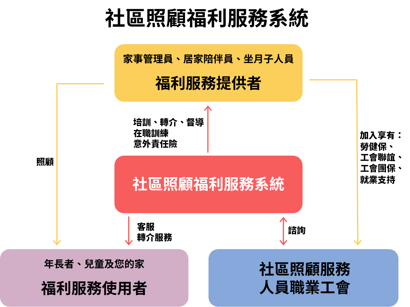 我們將人一生中需要的照顧,分成嬰幼兒照顧、學齡前幼兒照顧、國小學童課後照顧、老人照顧和家事服務,目前社區照顧福利服務互助系統有社區保母系統及公共托嬰中心、非營利幼兒園、家事管理、居家陪伴、老人支持服務等專案,並與臺北市優質保育公益協會等團體合作進行課後照顧方案,提供 0-99歲一生的照顧。