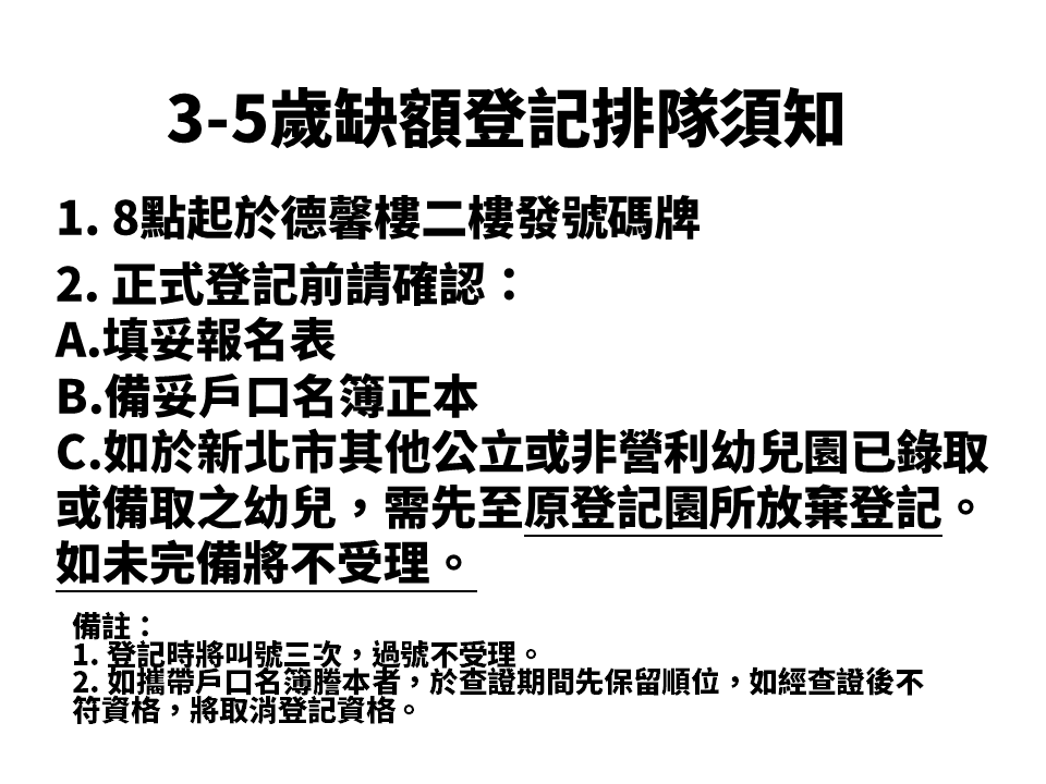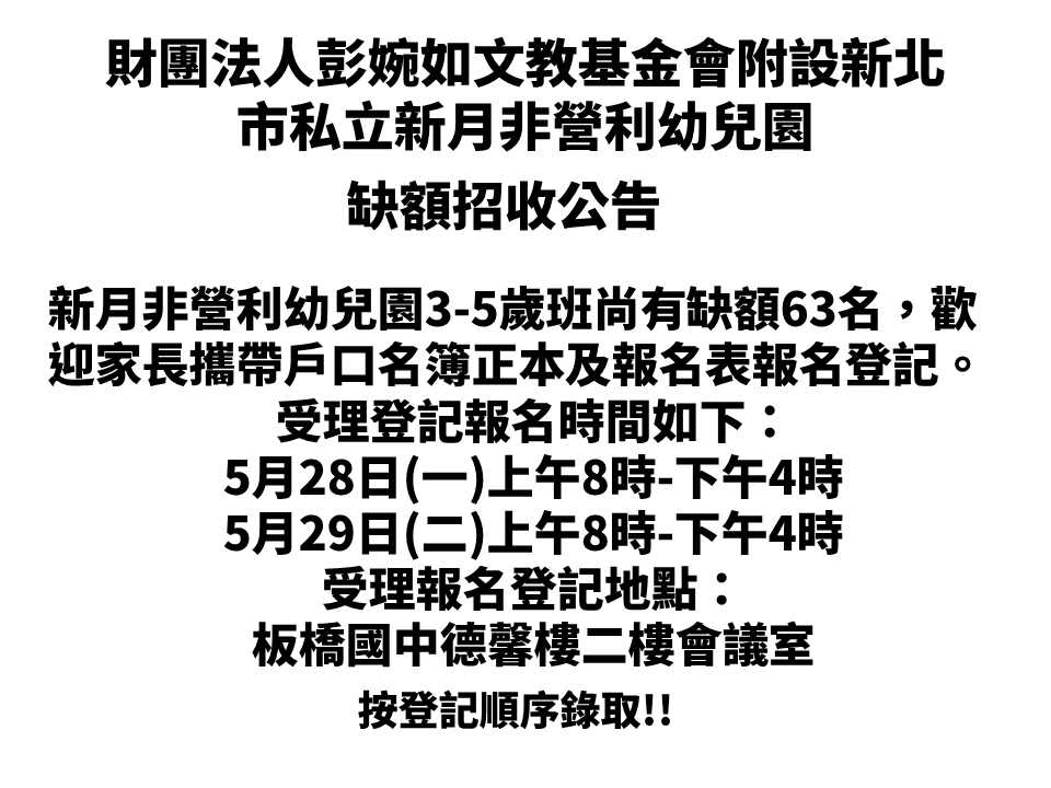 5/28PM2:24最新公告:新月非營利幼兒園3-5歲班已經額滿,若前來登記的幼生將為備取!謝謝各位家長!如有您已經有登記其他園所也是備取,還是只能擇一園登記喔! 備取順序請見送件後收執聯,目前無法從系統查詢。如有備取名額釋出可依序遞補上,將主動電話聯繫您前來報到,謝謝!
