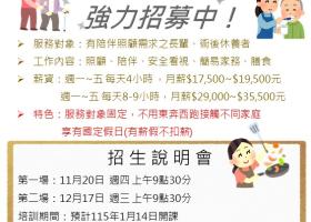 【培訓對象】:識字能書寫,有愛心、耐心陪伴老人,體力佳身體健康,擅烹飪佳 【說明會地點】:桃園市桃園區南華街60號3樓之2  【說明會日期】: 第一場:114年11月06日 週四 下午14點00分 第二場:114年11月14日 週五 上午9點30分 第三場:114年11月20日 週四 上午9點30...