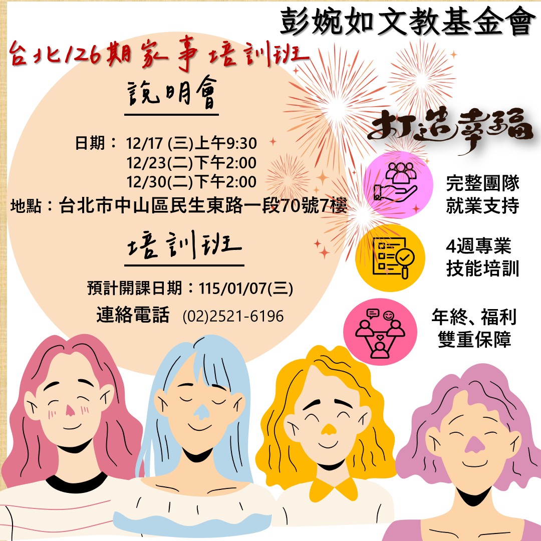 [台北]家事126期培訓說明會 12/17(三) ,12/23(二) ,12/30(二)