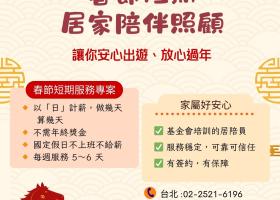 春節限定短期居家陪伴照顧服務專案|讓您安心過好年 農曆春節是家人團聚的重要時刻,然而許多家庭因返鄉、出國或照顧人力調度問題,面臨春節期間長輩照顧的空窗期。為協助家庭安心過年,本基金會推出 「春節短期居家陪伴照顧服務專案」,提供專業、可靠的短期居家陪伴照顧服務。 專案適用期間 115年1月19...