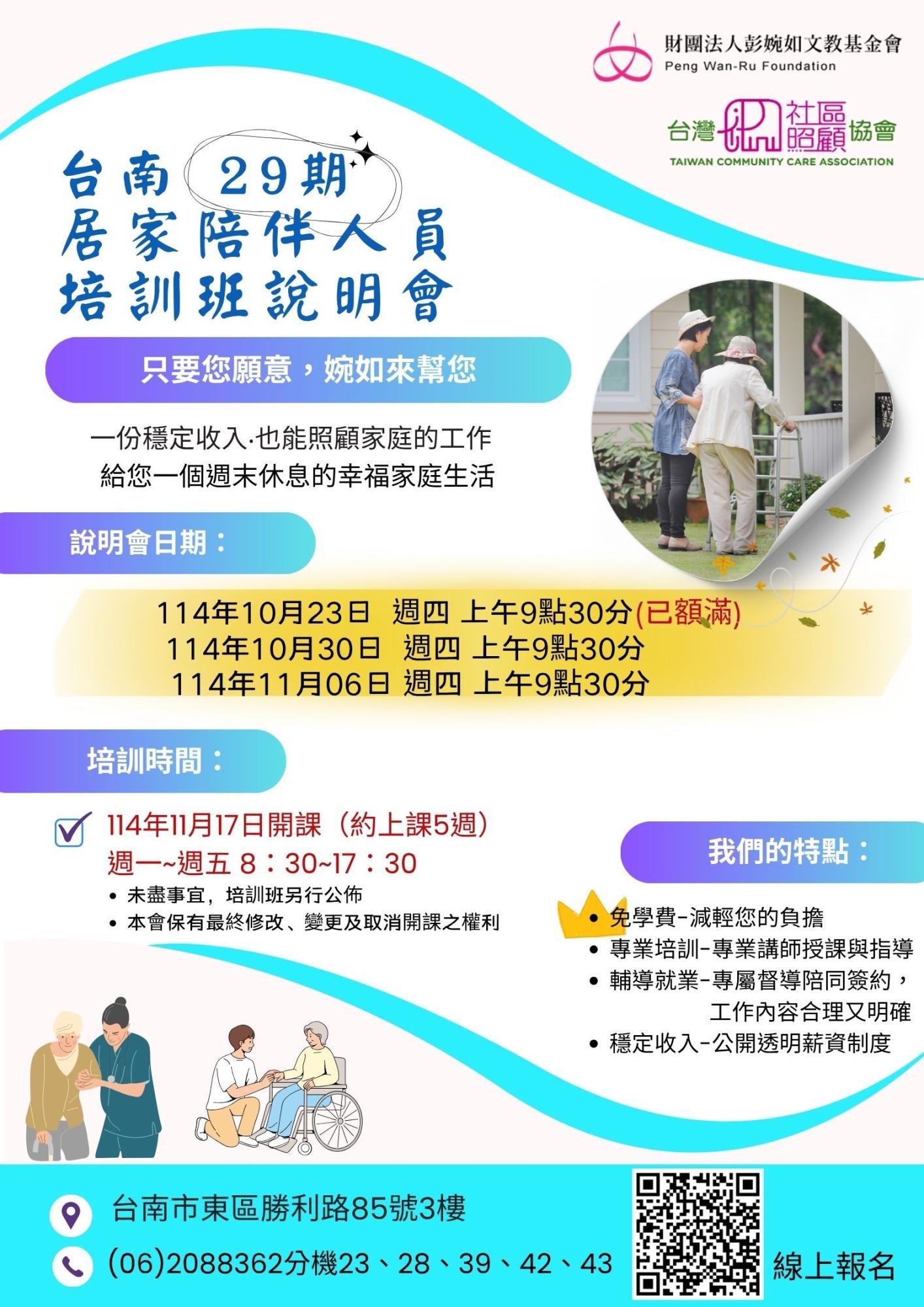[台南]10/30(四)居家陪伴29期培訓說明會9:30