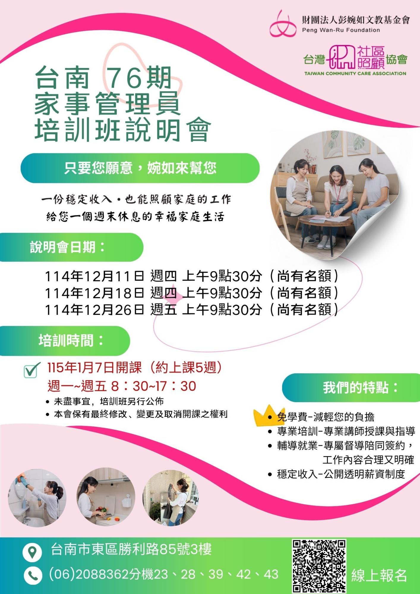 [台南]12/18(四)家事76期培訓說明會9:30