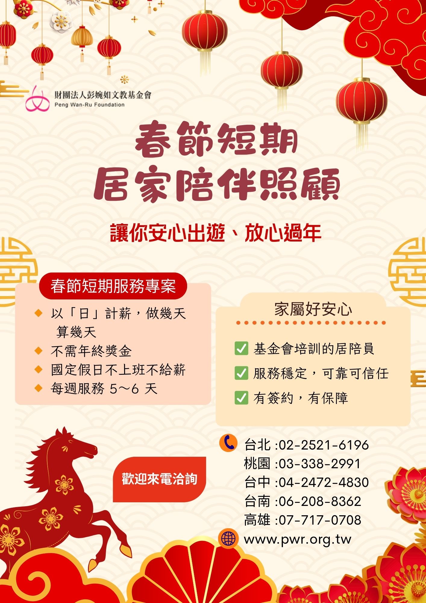 春節期間服務人力有限,若有需求者建議家屬電洽各區辦公室,由專人為您說明春節短期陪伴照顧服務專案內容。