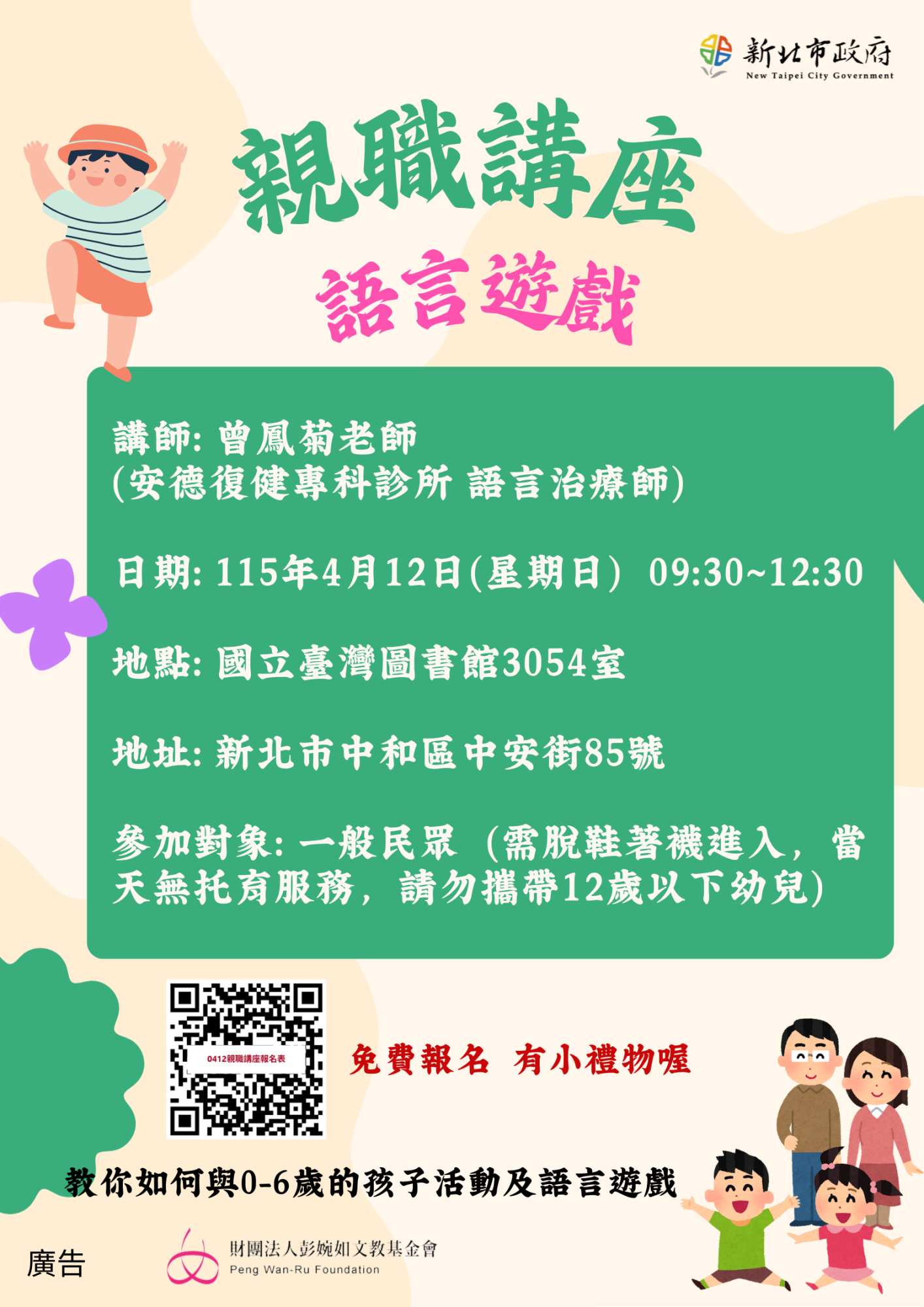 - 參加對象:一般民眾(教室內需脫鞋著襪進入,當天未提供托育服務,請勿攜帶12 歲以下小孩入場)