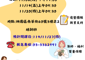 預計114年11月4日開課,培訓日期:周一至五8:30-17:00(以實際招生狀況及課表為主),約一個月